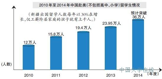 美国驻华大使馆高级教育专员卢晨光介绍,根据美国门户开放报告数据显示,2010年之前,美国留学最多的是印度学生,2010年中国以12万的留学生数字排名第一,之后一直处于首位,并且每年都在大幅度增加。2013年,在美国留学的中国留学生已经达到23.95万,预计今年将达36万。