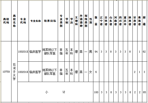 今年,石河子大学将招收临床医学专业国防生100名(男生94名,女生6名),分布于新疆、山东、陕西、河南、吉林、辽宁、四川、重庆、甘肃和青海10个省(区),是兰州军区签约高校唯一一所招收医学专业国防生的高校。石河子大学临床医学专业为国家级特色专业,也是学校的优势专业。报考石河子大学临床医学专业国防生,既可读重点大学,又能圆军官梦;国防生采取提前批次录取,多了一次选择机会,未被录取为国防生的,不影响第一批次及以后志愿的正常录取;在享有与普通大学生同等权利的基础上,军队每年为每名国防生提供1万元奖学金;国防生在校期间,在不影响正常学习的情况下,组织必要的军政训练和假期实践锻炼,逐步培养军政素质,提升综合素质;国防生在顺利完成大学学业和军政训练后,直接到部队工作,成为新时期一名军官。