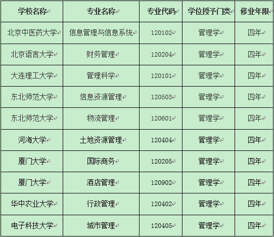 管理科学与工程类和工商管理类增设频率排在其次,分别有2所高校增设,具体为:北京中医药大学的信息管理与信息系统专业、大连理工大学的管理科学专业属于管理科学与工程类,北京语言大学的财务管理专业、厦门大学的国际商务属于工商管理类。