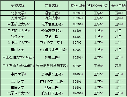 在新增的、属于工学学科门类的基本专业中,以电子信息类专业增设频率最高,有4所学校开设,分别是北京大学的通信工程专业,中国矿业大学(徐州)的电子信息工程专业,合肥工业大学的电子科学与技术专业,中国石油大学(华东)(华东)的光电信息科学与工程专业。
