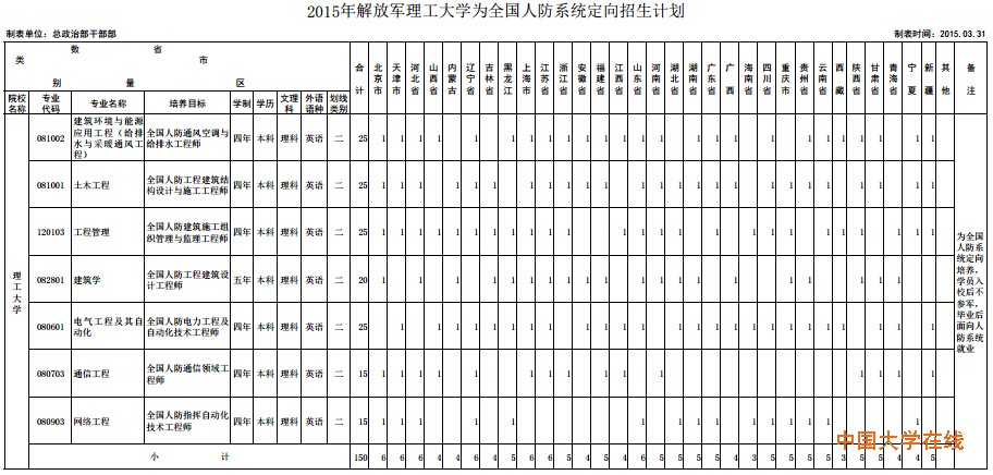 2015年解放军理工大学为全国人防系统定向招生计划已公布,具体如下: