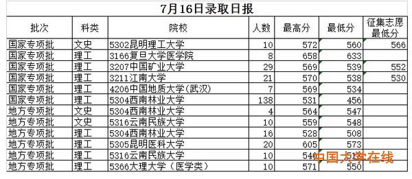 7月16日,云南省招生考试院继续发布“录取日报”,当日6所院校在国家专项批次录走213人,加上前3天录取的人数,国家专项批次已录走2317人。此外,当日地方专项批次也开始录取,4所院校共录走70人。