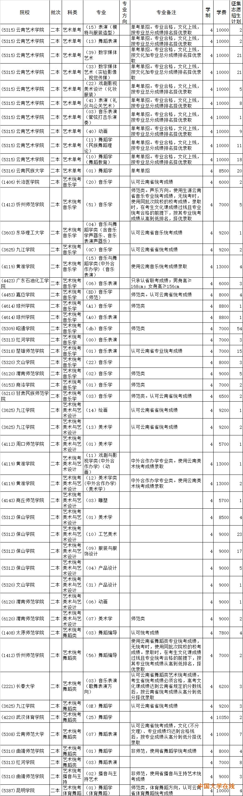 2015年云南高考二本艺术类降分征集志愿招生计划