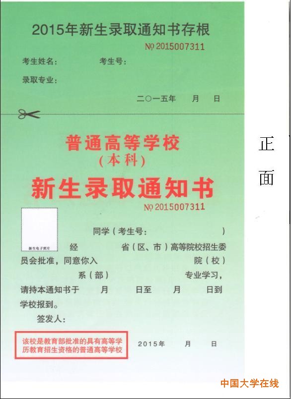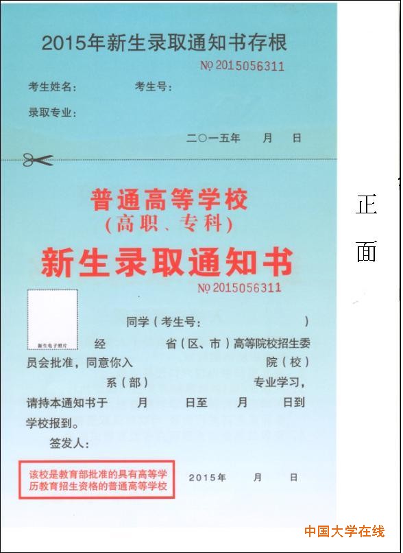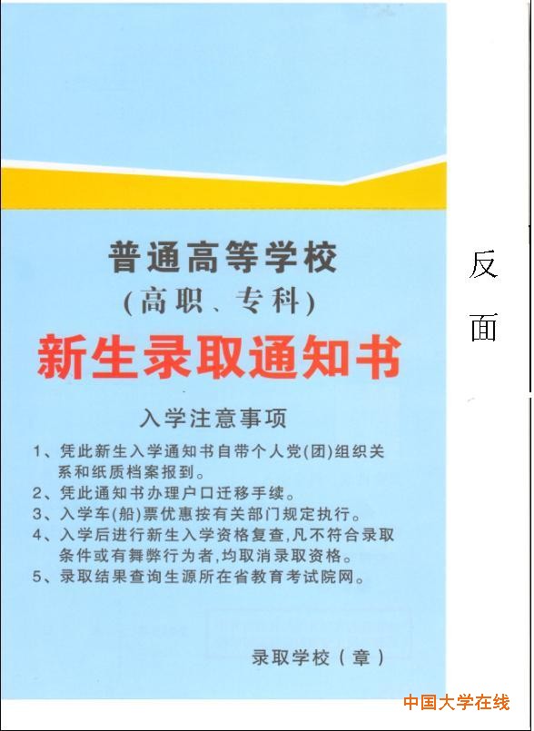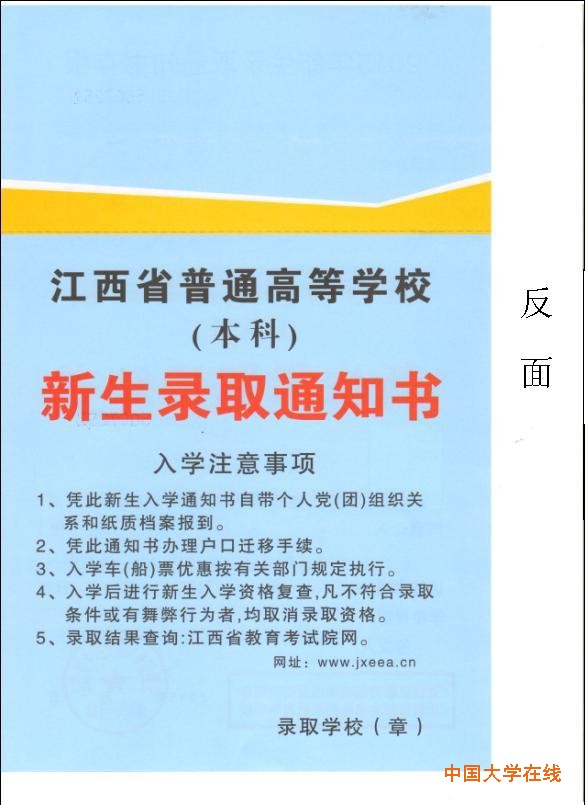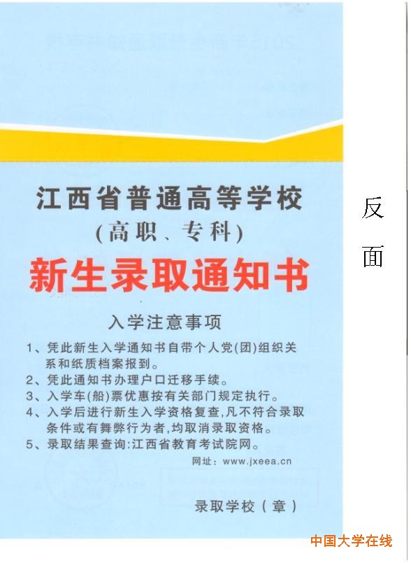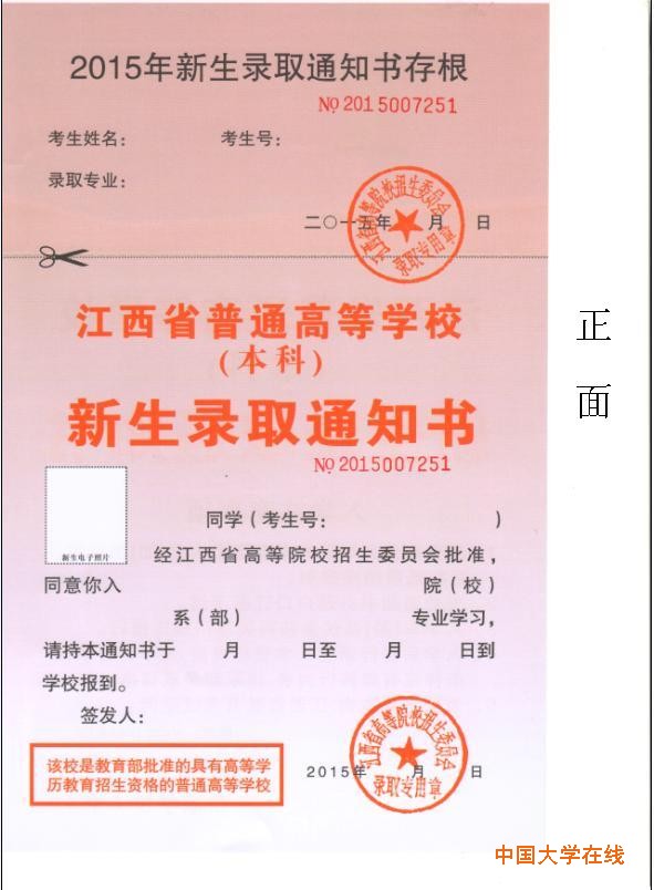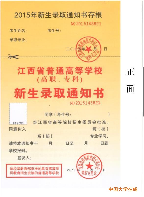 本省所有高职(专科)层次的院校和民办本科院校在省内外招生的新生录取通知书均由我院统一印制,在省内招生的加盖“江西省高等院校招生委员会录取专用章”,在省外的不盖录取专用章,样式如下: