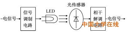 图1 描述了一个基本的光通信系统组成,其主要包括信号发送部分和信号接收部分。在发送端,由编码器编码的数据经信号调制电路转换成发送电信号,然后驱动LED 路灯光源发送光信号经自由空间光通路到信号接收端。在接收端,通过光传感器和放大器检出光信号并转换成电信号。最终经解调电路、解码器获得相应数据。