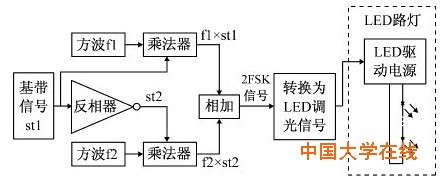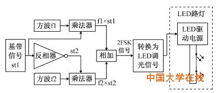 由于LED 路灯本身肩负的照明职能,如果单纯采用OOK 编码,势必导致数据传输时LED 路灯出现闪烁的现象,这样对正常照明是不利的,所以进一步优化为二次调制模式。所谓二次调制,就是先将基带信号调制到一个较低频率的载波,模式为2FSK,载波本身为方波信号,然后再用调制后的方波信号再一次调制光波,模式为OOK。