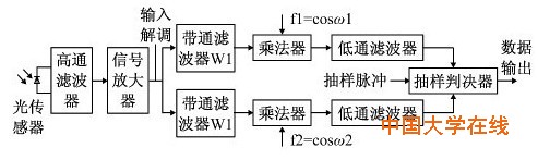 信号解调电路如图3 所示,变化的光信号由光传感器检测出来后,通过“高通滤波器”滤掉直流和低频( 主要是工频) 成分后进行放大,放大后的信号输出到解调电路,通过相干解调和低通滤波、抽样判决得到所需数据。