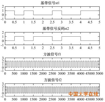 将以上研究设计思路采用Matlab 进行仿真,基带信号速率采用100bps,考虑到可选择元器件的限制,f1 选择800Hz,f2 为1000Hz,仿真结果证明该方案可行。