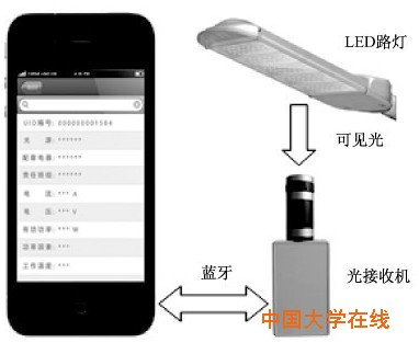 如图7 所示,现场测试系统的组成包括内置光通信控制器的LED 路灯,光接收机,智能手机设备( 内置读取数据显示的应用程序) 。光接收机与智能手机间通过蓝牙进行数据传输,以确保在路灯现场测试的方便性。