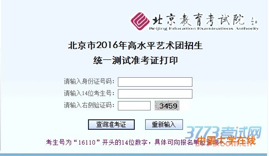 北京市2016年高水平艺术团招生统一测试准考证打印
