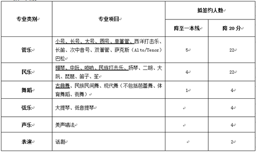 (3)符合条件(1)(2)考生,根据签约人数,按各艺术专业项目测试成绩排名,从高到低顺次获得降分优惠。根据艺术团需求,对重点招收的专业且少数艺术测试成绩特别优秀的考生可降至一本线。
