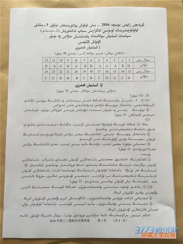 2016乌鲁木齐二模民语系政治试题答案及评分标准
