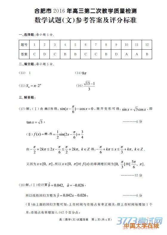 合肥市2016年高三第二次教学质量检测数学试题(文)参考答案及评分标准