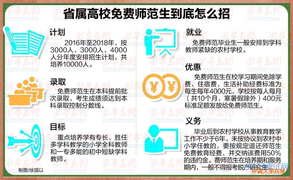 免费师范生享受什么样的优惠?省教育厅规定,免费师范生在校学习期间免除学费、住宿费,并给予一定的生活补助。所需经费由省财政按每生每年10000元的标准拨付高校。其中生活补助经费标准为每生每年4000元,学校按每人每月(共10个月,寒暑假除外)400元标准足额发放给免费师范生。