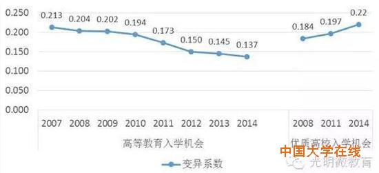 我国各地区高等教育的入学机会总指数均呈现出稳定的逐年上升趋势,与2007年相比,到2014年入学机会的增长幅度高达32.0%;与总体入学机会相比,2008年到2014年优质高校的入学机会同样呈现逐年上升的趋势,然而它的增长幅度则相对较小,与2008年相比,2014年的入学机会仅增长4.6%。根据31个省在各年度的变异系数可以发现,近十年来在各省之间入学机会的差异逐年缩小。特别是2010年后,变异系数以每年更大的幅度逐年减低。到2014年变异系数降到0.137,与2007年的0.213相比缩小的幅度达到35.7%。这说明我国高等教育入学机会在地区之间的公平程度逐年提升。然而,优质高校入学机会在地区间的差异则不但没有缩小,反而呈现了逐步扩大的趋势,与2008年相比,2014年各省之间的差异性提高了19.6%。这说明,各地区适龄人口进入一流高校的入学机会存在越来越明显的差异。