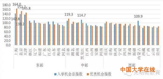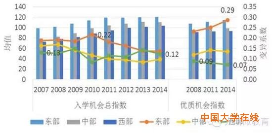东中西部总入学机会水平逐年缩小,优质入学机会逐年扩大