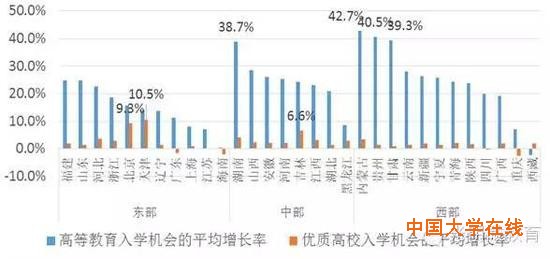 在优质高校的入学机会方面,东部的浙江、中部的吉林、湖北和西部的重庆等地区排在前位,这些地区当地优质高校数量并不多,但这些高校在名额分配上则更倾向于向本地考生倾斜。以浙江为例,2014年浙大在浙江省的招生计划为2400人,占总招生计划的比重就高达50%。招生属地化倾向带动了浙江优质高校入学机会的提升。优质机会增长速度最快的为天津、北京和吉林,年平均增长率达到10%、9.3%和6.6%。