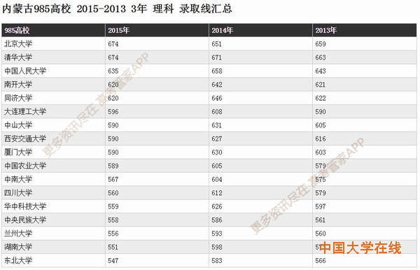 下图为大家展示内蒙古历年985高校理科录取分数线;
