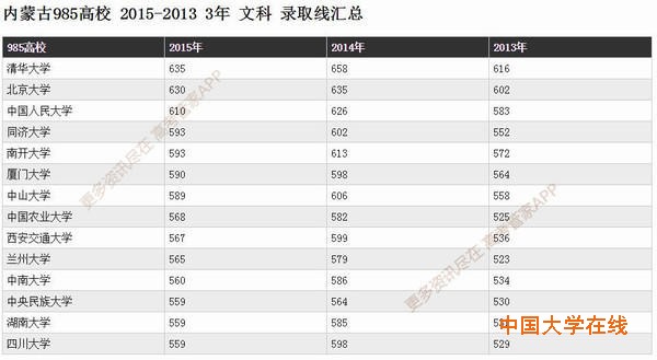 下面为大家展示内蒙古历年985高校文科录取分数线;