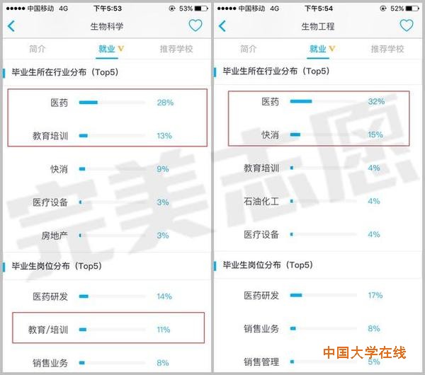 从就业去向来看,方向相似的理学和工学类专业的就业行业分布是基本一致,但又有略微不同的。依旧以生物科学和生物工程专业为例。从完美志愿独家大数据分析来看,这两个专业的学生毕业后分布最多的行业都是与生物对口的医药行业。但是在理学专业生物科学的行业分布中排行第二的是教育培训类行业,而在工学专业生物工程的行业分布中仅次于医药行业的是快消行业,仅有4%的毕业生选择了教育培训行业。