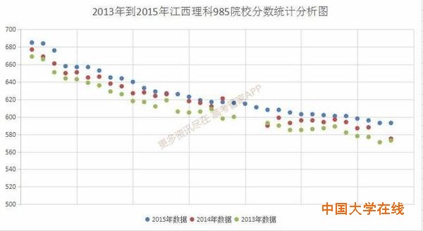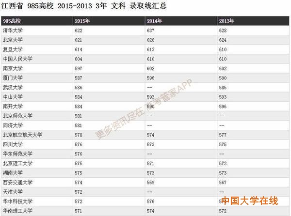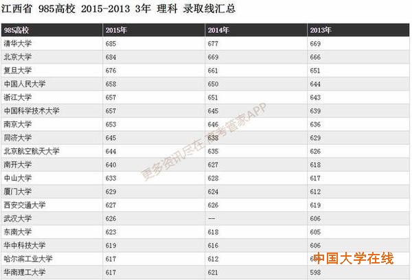 历年拥有35万考生的江西省,地理位置也优越,却没有一所985大学,追求更好大学梦,只能背起背包去外省求学。百年英才小编这里整理历年985高校在江西省录取分数,供2016的江西学子报考985大学参考。2015年江西省一本录取分数线:理科540分,文科528分。2014年一本录取分数线:理科526分,文科524分。2013年一本录取分数线:理科517分,文科532分。 下面为江西省理科历年985录取分数线;