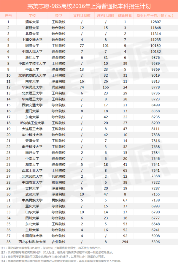 随着高考临近,各高校陆续公布2016招生计划,上海考生已于5月20日率先开始填报志愿。完美志愿基于和考试院完全一致的招生计划和录取数据,结合独家就业大数据,整理分析了39所985高校2016年在上海的普通批本科招生数据,并按照毕业五年平均月薪进行排行。分析发现,在普通批本科招生中,清华大学和北京大学不参与,想要填报的考生需在综合评价批和提前批中进行选择,另外各高校理科招生人数普遍多于文科招生人数,部分高校甚至只招理科生。 清华和北大不参与上海普通批本科招生