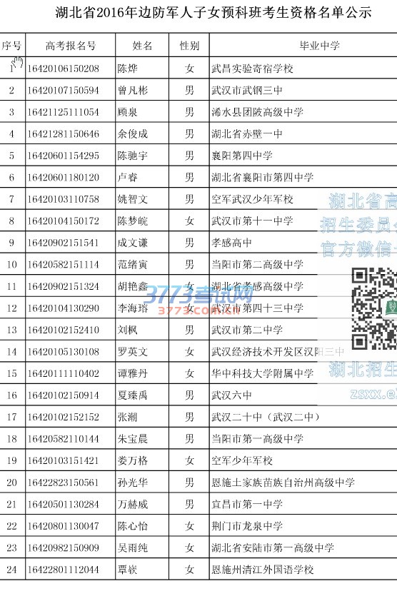 湖北省2016年边防军人子女预科班考生资格名单公示