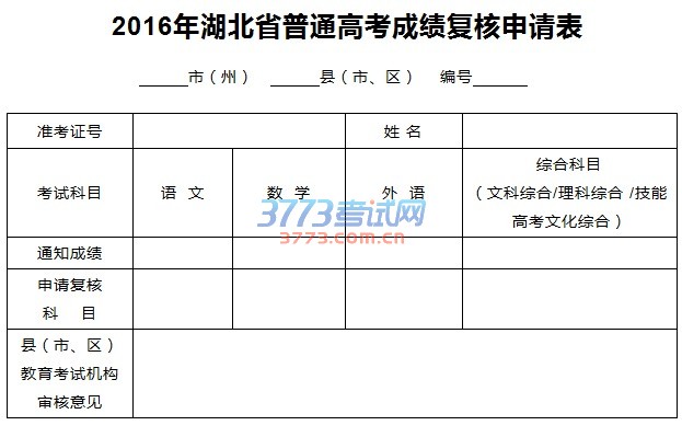 全省2016年普通高考成绩复核工作时间为2016年6月27-28日。对本人高考成绩有异议的考生,应于6月26日17:00点前(含)携带本人居民身份证和准考证,到报名所在地的教育考试机构填写《湖北省2016年普通高考成绩复核申请表》(此表由各地印制),提出复核申请,逾期不予受理。每名考生只能申请一次成绩复核,申请科目数不限(最多4科)。当地考试机构汇总后通过普通高考考务平台,将申请复核分的数据库报送省教育考试院。
