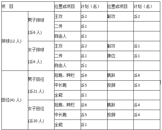 注:1.男子排球身高要求:主攻、二传1.80米以上,副攻、接应 1.85米以上。女子排球身高要求:主攻、副攻、二传1.70米以上,接应 1.75米以上。2.田径不招马拉松和竞走类。3.因我校在西藏、上海没有投放招生计划,所以生源所在地为西藏、上海的考生不允许报考。