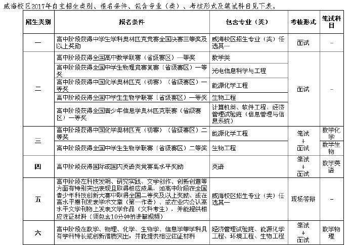 校本部2017年自主招生类别、报名条件、包含专业(类)、考核形式及笔试科目见下表。