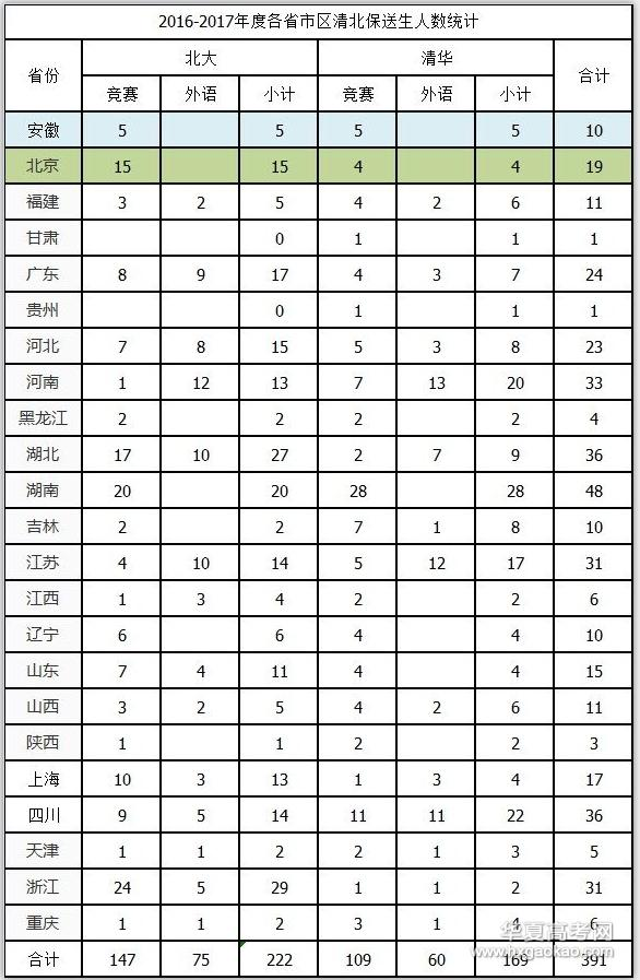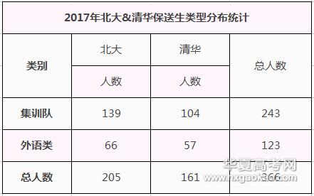 日前,阳光高考网公布高校2017年高考保送生拟录取名单,其中,北大222人,清华169人。2017年北大清华保送生全部来源于集训队和外语类保送。