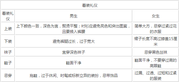 着装正式至少不会令你减分。尽量穿一套你自己舒服也能让别人看着舒服的衣服。前者提升你的发挥,后者能让别人对你印象较好,减低被问过难问题的概率。穿戴整洁,朴素大方。服装追求一种简约风格,以给人一种充满活力、阳光健康、朴实有内涵的感觉。避免“高大上”,亦不必穿西装、打领带给人一种过分成 熟、缺乏朝气的印象。不佩戴饰品,不化妆。男生不留长发、不染发;女生不烫发、不染发,不穿高跟鞋。