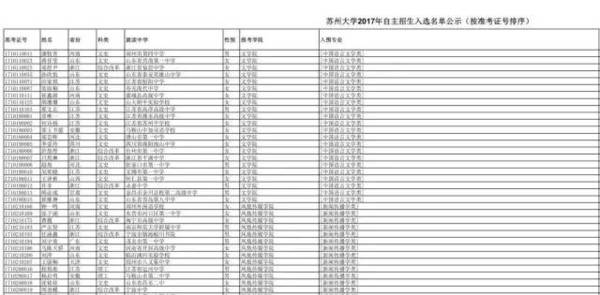 根据教育部有关文件的精神以及《苏州大学2017年自主招生简章》的有关规定,我校自主招生考试工作已经结束。经学校研究,现就我校2017年自主招生成绩及入选考生名单予以公示,具体通知如下: