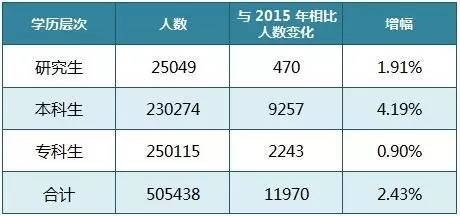 广东省2016届普通高校毕业生人数(指截至2016年9月1日的普通高校全日制毕业生人数,不含因休学、结业、肄业等未取得毕业资格的毕业生及港澳台地区、外籍生源毕业生2.9万人,数据来源自广东省高校毕业生就业管理系统,如无特殊说明,本报告数据均来源于此系统)为505438人,比2015年增加了11970人,增幅为2.43%,增幅比2015年减少4.97个百分点。