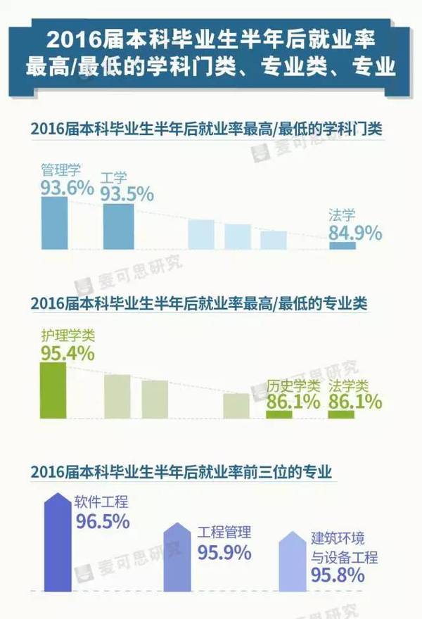 2016届本科毕业生半年后就业率最高的学科门类是管理学,达93.6%,其次是工学,为93.5%;最低的是法学,为84.9%。就业率最高的专业类是护理学类,达95.4%,最低的是历史学类、法学类,均为86.1%。就业率前三位的专业是软件工程、工程管理、建筑环境与设备工程。