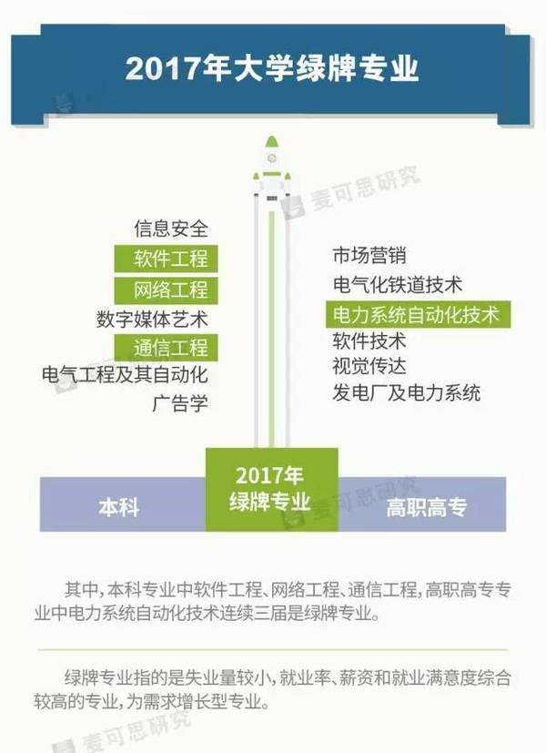 根据报告,2017年本科就业绿牌专业包括:信息安全、软件工程、网络工程、数字媒体艺术、通信工程、电气工程及其自动化、广告学。其中,软件工程、网络工程、通信工程连续三届是绿牌专业。