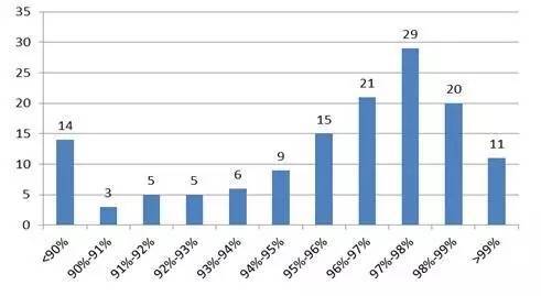 从院校初次就业率分布区间看,广东省138所普通高校中(因8所研究生培养单位人数较少,不纳入此处统计),初次就业率在97%(含)至98%区间最多,有29所;其次是96%(含)至97%区间,有21所。就业率在99%及以上的院校有11所,有14所院校就业率不足90%。
