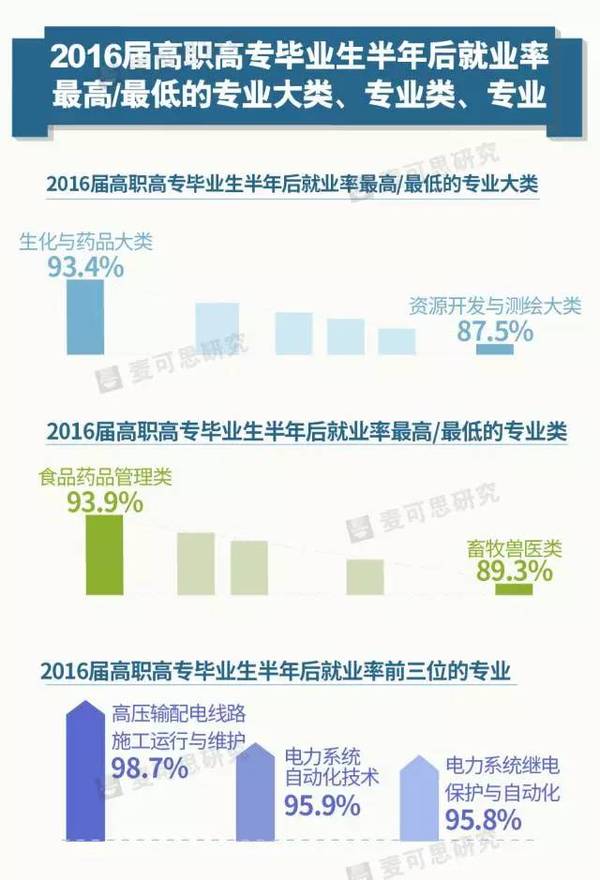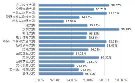 专科毕业生初次就业率为95.75%,比2015年减少了0.16个百分点。各专业大类的就业率均为93%以上,其中水利大类毕业生就业率最高(99.78%),其次是农林牧渔大类(98.57%),第三是生化与药品大类(98.25%)。