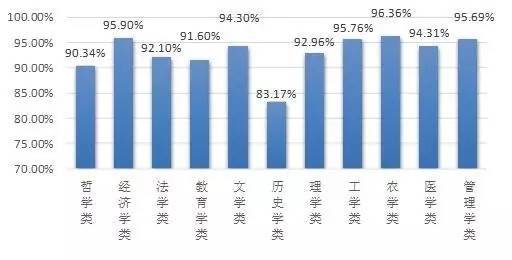 本科毕业生初次就业率为94.80%,比2015年增加了0.72个百分点。从学科就业率看,高于本科平均初次就业率的学科有农学类、经济学类、工学类、管理学类4个学科,其中农学类毕业生就业率最高,为96.36%;其次是经济学类,就业率为95.90%。就业率较低的学科有历史学类、哲学类和教育学类,分别为83.17%、 90.34%和91.60%。