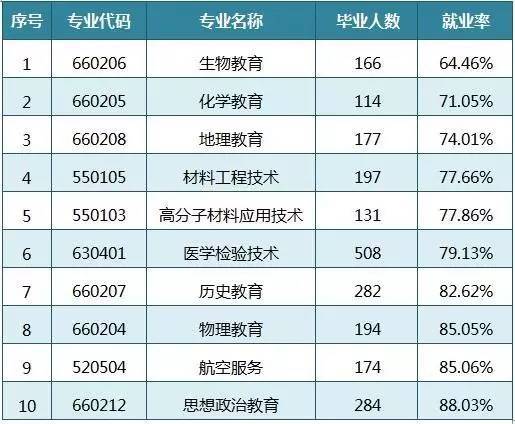 就业率最低的10个专业中,有6个专业属文化教育大类。最低的是生物教育,为64.46%;其次是化学教育,为71.05%;第三是地理教育,为74.01%。