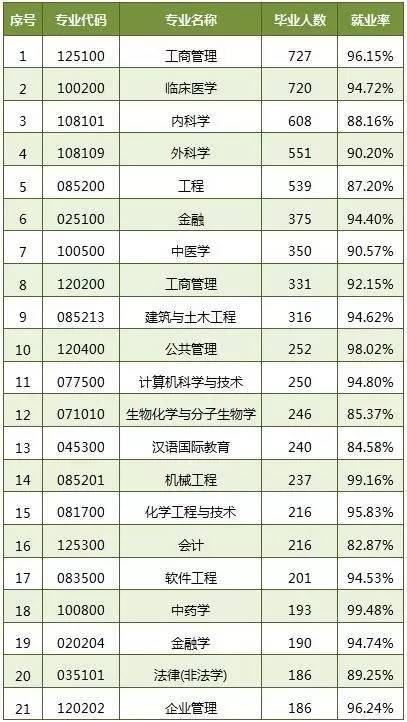 在人数最多的前20个专业中,就业率最高的是中药学,为99.48%,其次是机械工程,为99.16%;最低的是会计,为82.87%,其次是汉语国际教育,为84.58%。