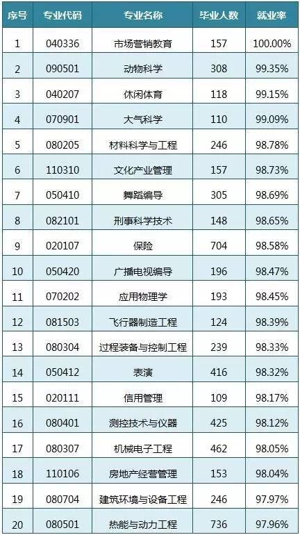 从国家设置的标准专业(毕业生人数在100以上)看,就业率最高的是市场营销教育,为100%;其次是动物科学,为99.35%;第三是休闲体育,为99.15%。就业率最高前20名中,属工科类的专业最多,有8个。