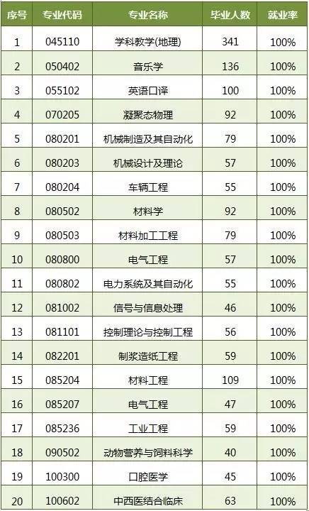 从国家设置的标准专业看,就业率为100%的专业(毕业生人数在40及以上)有20个,属工科类的专业最多,有13个。