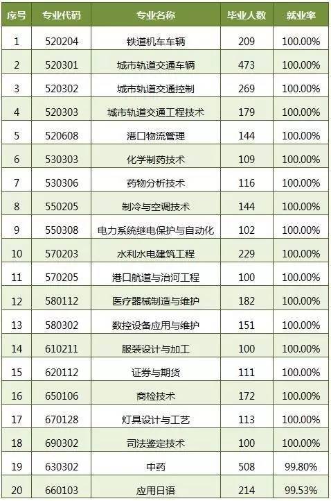 从国家设置的标准专业(毕业生人数在100以上)看,就业率为100%的有18个,属交通运输大类的最多,有5个。