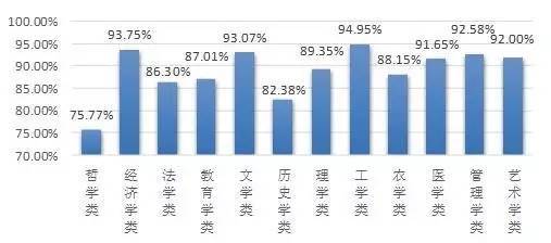毕业研究生初次就业率为91.51%,比2015年增加了1.01个百分点。从学科就业率看,高于研究生平均初次就业率的学科有工学类、经济学类、文学类、管理学类、艺术学类、医学类6个学科。其中工学类毕业生就业率最高,为94.95%;其次是经济学类,就业率为93.75%。就业率较低的学科有哲学类、历史学类和法学类,分别为75.77%、 82.38%和86.30%。
