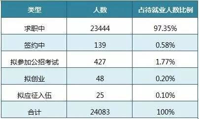 2016年我省高校毕业生有就业意愿尚未就业人数为24083人,待就业率为4.76%。其中“求职中”人数最多,有23444人,占待就业人数的97.35%,其次是“拟参加公招考试”,有427人,占1.77%。