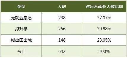 暂不就业人数为642人,暂不就业率为0.13%。其中238人无就业意愿,占暂不就业人数的37.07%,256人拟升学,占39.88%,148人拟出国出境,占23.05%。
