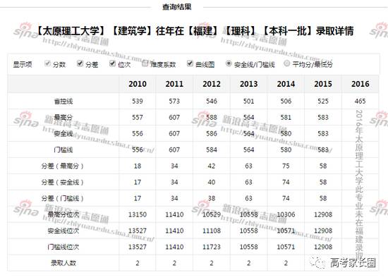 比如,我们点击太原理工大学,可以看到太原理工大学2009-2015年建筑学专业在福建理科的录取分数分别是578分、556分、607分、584分、564分、580分和583分(图2),从下图中可以看出,太原理工大学建筑学专业每年只在福建招收2名考生,报考难度较大。这些信息都可以在新浪高考志愿通中查询到。