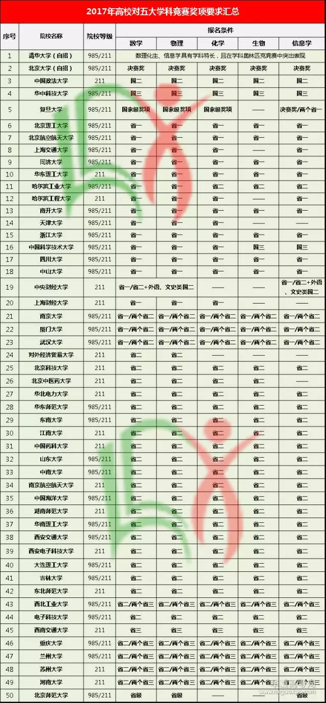 1、五大学科竞赛作为自主招生条件最重要的条件之一,在每年的自主招生报名过程中,彼受高校认可。当然不同的高校,要求等级不同。从整体来看,大部分高校要求等级和2016年一样,少部分高校存在调整,例如:北化工从2016年省三调整到省二,招生条件提高。