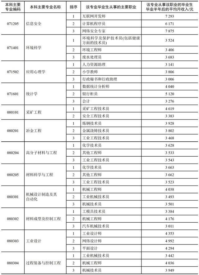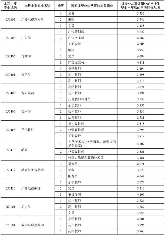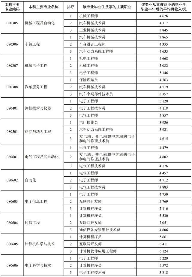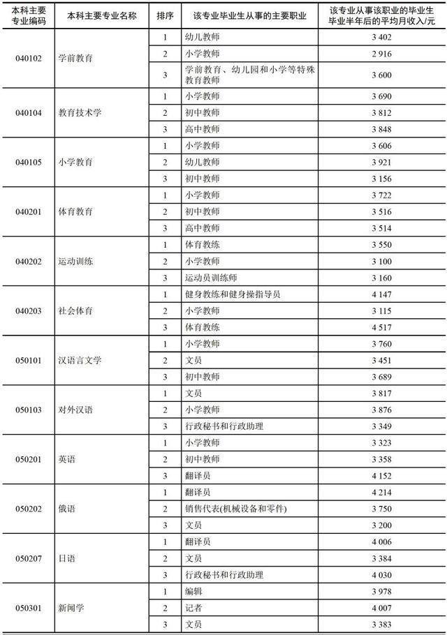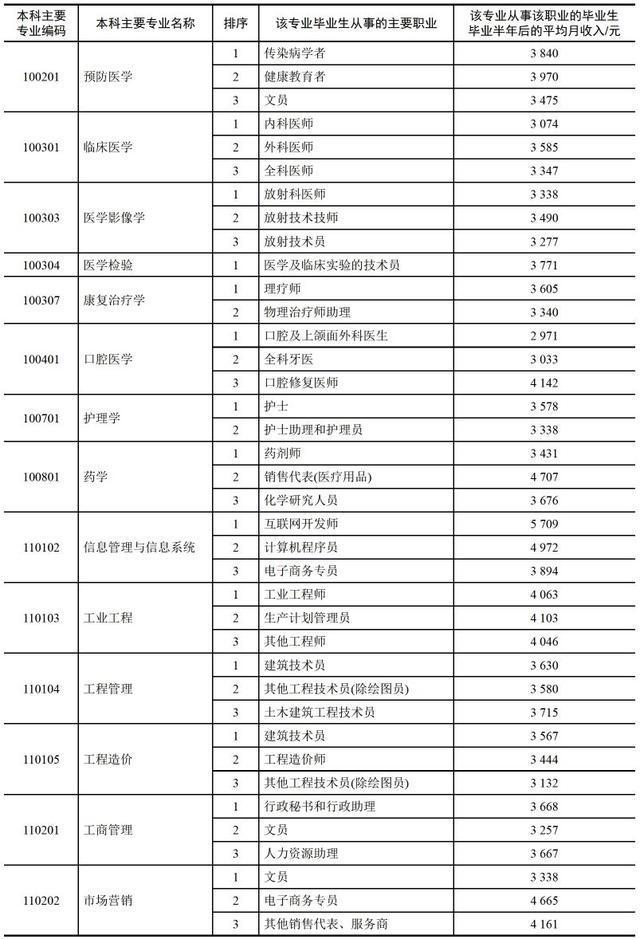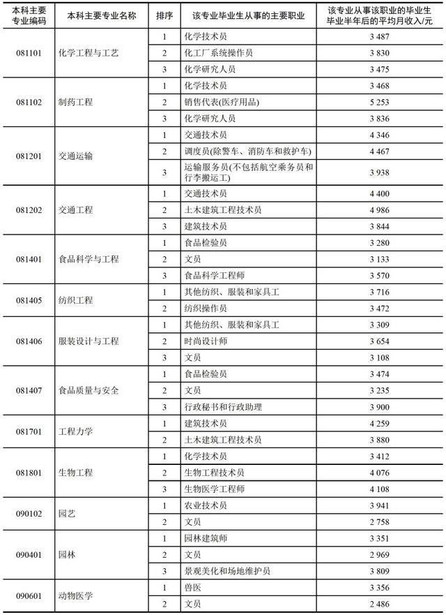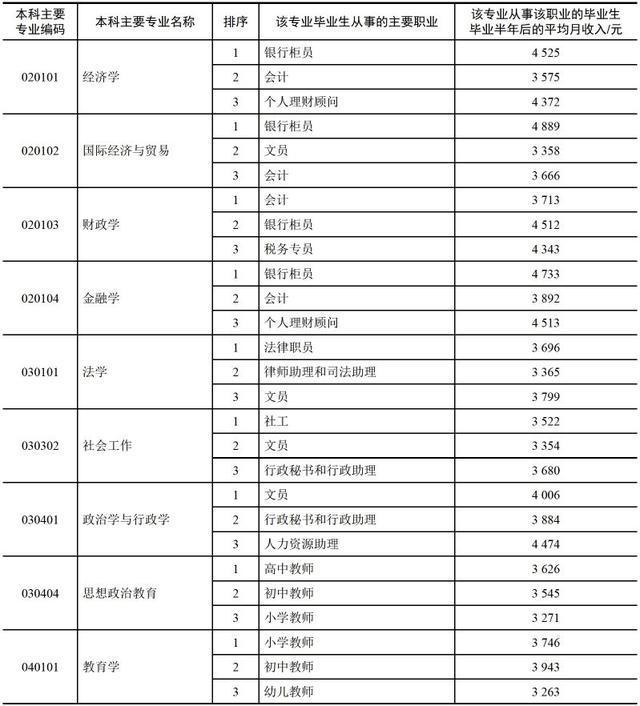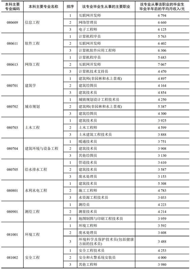 小编这里有一份较为详尽的表格,表格中提供了该专业中从事该职业的毕业生毕业半年后的平均月收入数据。(数据来自麦可思,个别专业未包括)